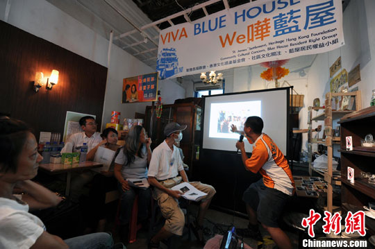 9月16日,香港媒体记者做客建于上世纪20至50年代的“湾仔蓝屋”,该楼位于社区中心地带,承载着草根阶层的生活文化,如果能够得到加固维修,将成民俗大观园。中新社发 郑祚声 摄