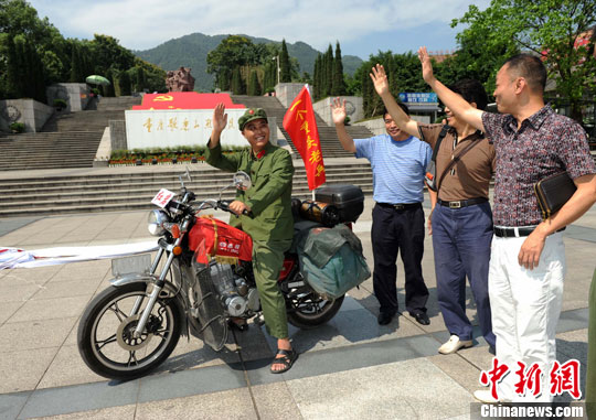 一身30年前的旧军装、一辆摩托车,52岁退伍老兵何昌平要从重庆驾车行驶2300多公里赶赴北京,看国旗行军礼。据悉9月16日何昌平已行驶250多公里抵达四川省达州市。中新社发 红岩联线 摄