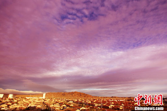 9月17日黄昏,受中国北方大面积冷暖气流交汇影响连续三天降雨后的内蒙古自治区阿拉善右旗红霞漫天。中新社发 任晨鸣 摄