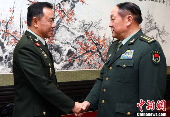 9月17日下午,国务委员兼国防部长梁光烈,在北京八一大楼会见来访的泰国武装部队最高司令宋吉滴上将,双方在友好的气氛中就双方关心的问题交换了意见。中新社发 宋吉河 摄