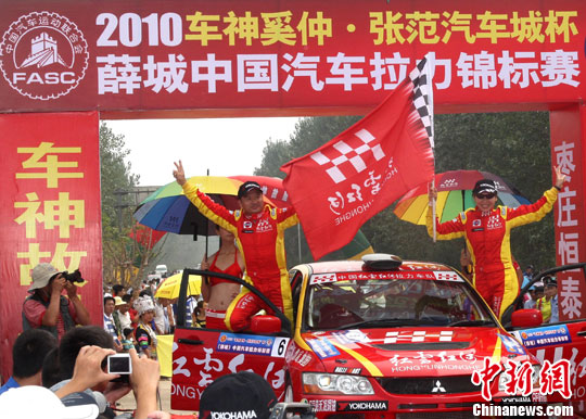 2010年“车神奚仲-张范汽车城”杯中国汽车拉力锦标赛9月17日在山东省枣庄市薛城区重燃战火。本站比赛是中国汽车拉力锦标赛(CRC)的第三站比赛。来自全国的20多支车队78辆赛车参加本站比赛,赛事全程约558公里,代表云南红云红河车队出战的香港车手陈自华夫妇通过发车台。中新社发 赵振清 摄