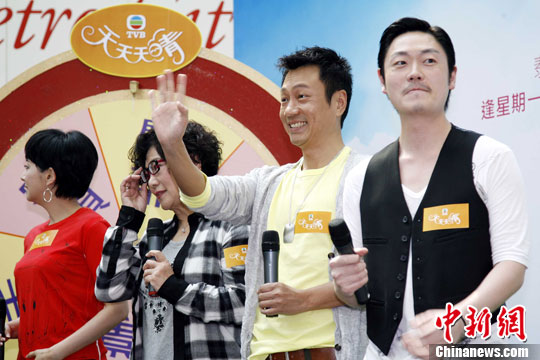 9月18日,正在热播的香港无线电视剧《天天天晴》剧组演员黎耀祥(右二)、毛舜筠、李司棋等一众艺人到新都城商场与观众同乐,祝愿观众天天好心情。