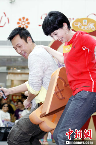 9月18日,正在香港热播的电视剧《天天天晴》剧组演员黎耀祥、毛舜筠到新都城商场与观众相聚,玩游戏共庆中秋节。中新社发 洪少葵 摄