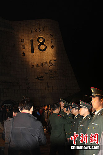 9月18日晚9时18分,辽宁省暨沈阳市在“九·一八”历史博物馆举行勿忘“九·一八”撞钟鸣警仪式,纪念“九·一八”事变79周年,提示人们勿忘国耻。中新社记者 沈殿成 摄