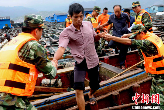 9月19日傍晚,福州连江县边防官兵冒着大风紧急转移该县可门海上养殖区渔排养殖人员。中新社发 刘可耕 摄