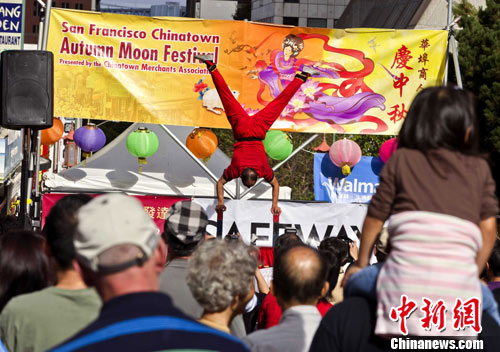 当地时间9月19日,美国旧金山中国城举办的中秋节街会闭幕,吸引大批华洋游客前来逛街,购物。图为游人在欣赏露天演出的杂技。