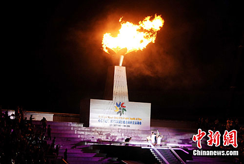 “共享阳光 你我同行”,第五届全国特奥运动会于9月19日晚8时在福州市省体育中心隆重开幕,本届运动会项目为历届最多,规模为历届最大。图为圣火点燃。王东明 摄