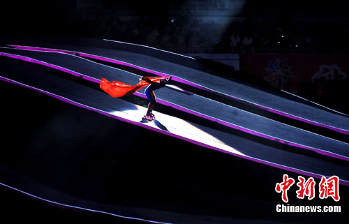 “共享阳光 你我同行”,第五届全国特奥运动会于9月19日晚8时在福州市省体育中心隆重开幕,本届运动会项目为历届最多,规模为历届最大。图为特奥运动员精彩轮滑表演。王东明 摄