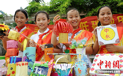 9月20日,安徽合肥一小学开展“小手拉大手 低碳迎中秋”活动,孩子们展示了自己利用废旧物品制作的月饼盒、工艺品和节日小礼物,倡导低碳度中秋。图为小朋友们在展示自己亲手制作的月饼盒。中新社发 韩苏原 摄