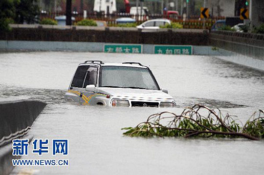 9月20日,高雄市区中华路地下通道积水未退,一辆汽车泡在水中。