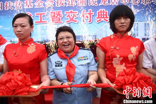 9月20日,由中国扶贫基金会援建的四川什邡市龙居小学项目竣工交付。“5.12”汶川地震曾使龙居小学教室全部坍塌,并致数名师生遇难,温家宝总理也曾于地震次日赶赴龙居小学看望安慰师生,指导救援。新建成的龙居小学可抵抗八级地震,总占地面积20000余平方米,可容纳千余名学生就读。图为该校名誉校长、歌唱家韩红出席竣工剪彩仪式。
