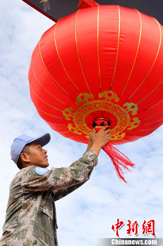 中秋佳节即将到来,远在非洲苏丹执行维和任务的中国第七批赴苏丹瓦乌维和工程兵大队的官兵们,将营区装扮一新,挂起大红灯笼,喜迎中秋。