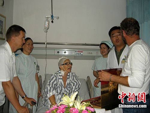 9月21日,桂林医学院附属医院的医护人员为来自法国的博蒙特夫人一家送去了月饼和鲜花,与博蒙特夫人一家人在中国提前欢度中秋节佳节。据了解,今年69岁的博蒙特夫人是随旅行团来桂林游玩,于9月11日在芦笛岩景区外不幸遭遇车祸。经当地医务人员的抢救,博蒙特夫人现在已经基本痊愈。当医生向博蒙特夫人一家介绍中秋节,并将月饼送到老太手上时,博蒙特夫人激动地说,感谢桂林医学院给了她第二次生命,她爱中国,爱桂林这座美丽的城市。中新社发 赵琳露 摄