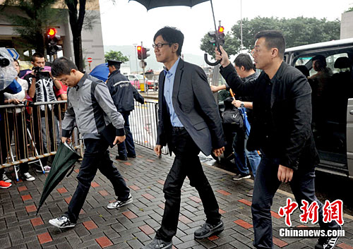 9月21日,香港无线电视业务部总经理陈志云、其助手丛培昆,以及无线电视市场及营业部业务拓展主管陈永孙,被控贪污及串谋诈骗等多项罪名,早上在香港东区裁判法院提堂,三人毋须答辩,各人准以十万元保释,押后至下个月19日再提讯。图为陈志云抵达法院下车时,艺员王喜为他以伞挡雨。中新社发 邓庆乐 摄