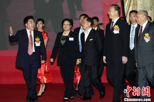9月21日,“全球华侨华人促进中国和平统一大会”在香港亚洲国际博览馆举行。全国政协副主席、中央统战部部长杜青林(右二)、全国政协副主席董建华(右)、香港特首曾荫权(右三)国务院侨办主任李海峰(左二)等出席开幕式。中新社发 洪少葵 摄