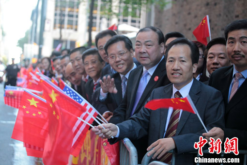当地时间9月21日傍晚,3000多名当地华人华侨聚集在纽约公园大道,迎接前来出席联合国会议的中国总理温家宝。中新社发 魏晞 摄