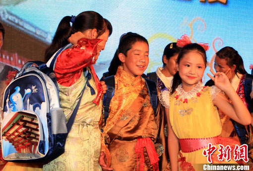 9月21日晚,14位应邀来上海看世博的西藏盲童从上海孩童手中接过崭新的书包,一起开心地合影,喜迎中秋佳节。当晚,上海著名玉佛禅寺举办“慈善·感恩·团圆”迎中秋晚会,西藏盲童们在现场与爱心人士们一起颂歌、赏月,感受大爱深情。中新社记者 潘索菲 摄
