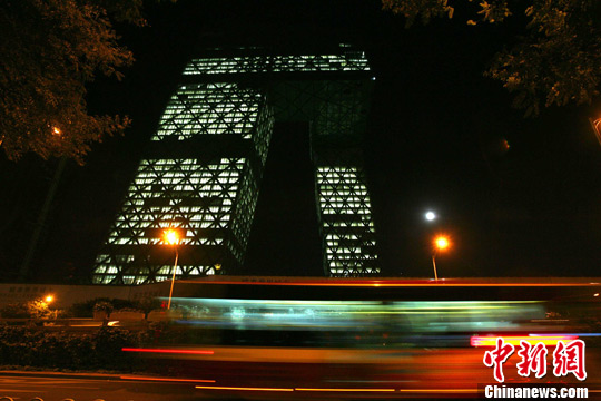 9月22日晚,位于北京东三环边的中央电视台新址大楼灯光亮起。据了解,这是该楼建成后首次整体试灯。中新社发 富田 摄