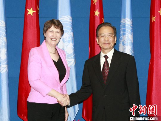 中国国务院总理温家宝9月22日在纽约联合国总部会见联合国开发计划署署长克拉克,并与之共同出席了中国和联合国开发计划署关于加强合作的谅解备忘录。中新社发 孙宇挺 摄