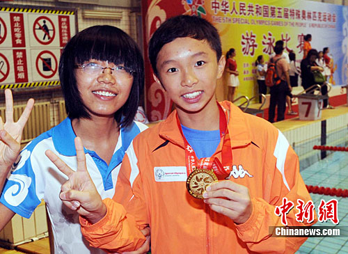 9月24日,中国第五届特奥运动会游泳赛事决赛在福州举行,香港代表团特奥选手蔡华杰(右一)夺得本届特奥会男子12-15岁组50米蛙泳冠军。图为蔡华杰与特奥会志愿者共同分享夺冠后的喜悦。中新社记者 刘可耕 摄