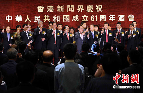 香港新闻界庆祝中华人民共和国成立61周年酒会,9月24日在香港金钟一酒店举行,由行政长官曾荫权、中联办副主任王志民及外交部驻港副特派员詹永新等担任主礼嘉宾。中新社发 谭达明 摄