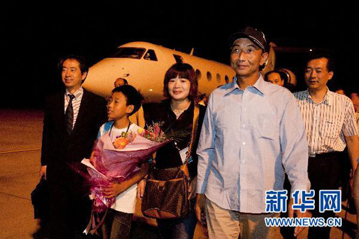 9月25日,詹其雄(前右)在妻儿和相关人员的陪同下离开包机。 当日4时,被日方非法抓扣的中国渔船船长詹其雄乘中国政府包机安全返抵福州。姜克红 摄