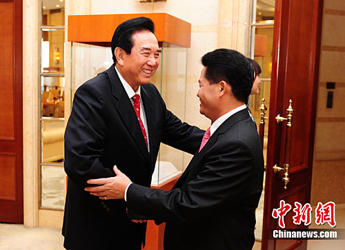 9月25日下午,海峡两岸关系协会会长陈云林(左)在北京会见了郑铭坤先生率领的台湾妈祖联谊会访问团一行。中新社记者 侯宇 摄