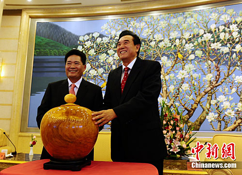 9月25日下午,海峡两岸关系协会会长陈云林(右)在北京会见了郑铭坤先生率领的台湾妈祖联谊会访问团一行。会见后,陈云林获赠由桧木制成的“聚宝瓶”纪念品。中新社记者 侯宇 摄
