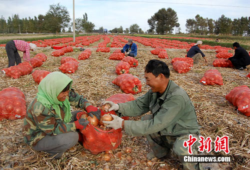 9月25日,甘肃省玉门市黄闸湾乡黄闸湾村葱农看着丰收的洋葱乐了。玉门位于甘肃西端,今年,这里种植的地膜洋葱喜获丰收,来自沿海城市和新疆的客商们纷纷前来收购。