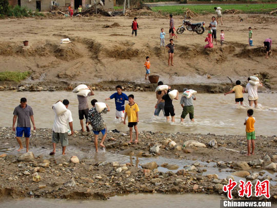 受灾民众背粮涉水返家