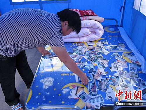 9月26日中午,广东省茂名市钱排镇灾区一位女灾民在临时安置点的帐篷内整理自己的家庭照片,这也是她从倒塌的房屋内拯救出来的唯一财产。柯小军 摄