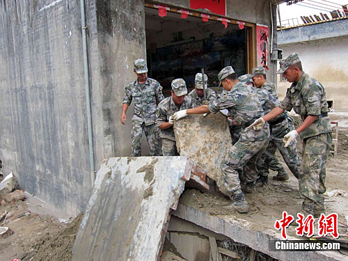 9月26日下午,几名解放军官兵奋力将受灾民众家中的石头搬开。连日来大批解放军官兵深入灾区,帮助受灾民众清理受损的家园。中新社记者 柯小军 摄