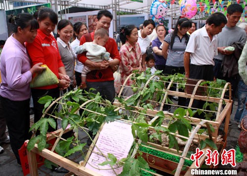 9月27日,在广西恭城瑶族自治县中心广场,市民游客在驻足参观食用菌立体栽培增收新模式实物展览。当日,广西恭城县举办瑶乡特产展示会,别具特色的食用菌、糯米酒、油茶、恭城月柿、脆柿等生态农产品吸引了大批各地游客和客商前来参观采购。