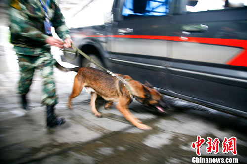 云南木康公安边防检查站位于中缅边境的云南德宏与保山龙陵的交界处。自1978年建站以来,木康站官兵共查缉各类毒品数十吨。2001年,木康站被国务院、中央军委联合授予“缉毒先锋站”荣誉称号。图为9月27日,木康检查缉毒犬在工作。