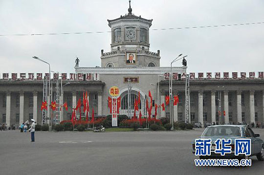 9月27日,朝鲜首都平壤火车站前党旗飘舞。赵展 摄
