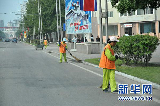 9月27日,朝鲜首都平壤的环卫工人在清扫街道。赵展 摄