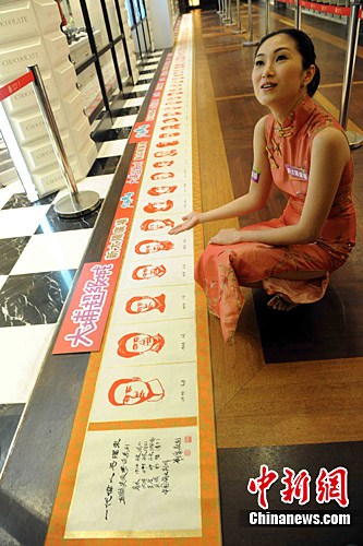 为迎接国庆黄金周,香港一商场9月27日起举行“红色收藏精品”展览。图为首次于香港展出的拥有83幅不同毛主席像的剪纸,共长1976点99公分。中新社发 谭达明 摄