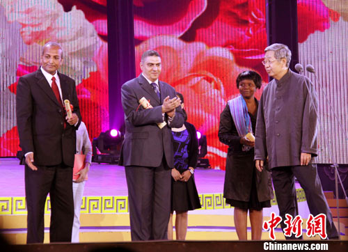 图为中国全国人大常委会原副委员长许嘉璐(右一)为2010国际“孔子教育奖”获得者尼泊尔非正规教育中心和埃及伊斯梅利亚省的代表颁奖。 中新社发 马圣泉 摄
