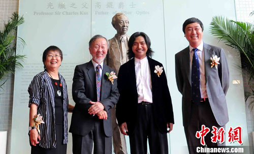 9月27日,高锟伉俪、中国艺术研究院中国雕塑院院长吴为山,以及香港中文大学校长沈祖尧(左起)主持中文大学高锟雕像揭幕典礼。高锟的铜像是著名雕塑家吴为山的作品,高2.2米,重400公斤。铜像神态潇洒自若,加上地面铺上白色小石块的设计,充分体现高锟谦谦学者的风范,以及高风亮节的气度。