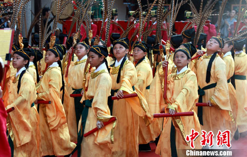 9月28日上午台北孔庙举行纪念孔子诞辰典礼。图为仪式上一群少年佾生十分投入地表演传统佾舞。