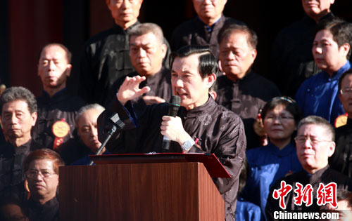 9月28日上午,台北孔庙举行纪念孔子诞辰典礼。台湾地区领导人马英九特地前往,由礼生引至大成殿向孔子上香。图为马英九上香后在孔庙殿前致辞,就其眼中的孔孟之道侃侃而谈。中新社记者 王健 摄