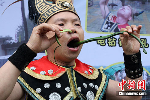 苗族汉子杨光将活生生的蛇从鼻孔钻进去又从口中钻出。中新社记者 肖前辉 摄