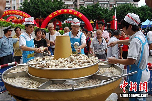 9月28日,第五届海峡(福州)渔业博览会上,福州特产鱼丸在超大火锅(直径2.2米)中一次性煮上千斤,一次可供千人免费品尝,当地民众大饱口福,排起长排品鱼丸。中新社发 张丽君 摄