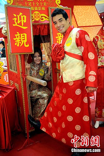 今年2010年10月10日寓意“十全十美”,为百年一遇的好日子,大量新人选择此日举行婚礼,香港一商场特设“花轿摄影廊”,让爱侣穿上传统长衫裙褂坐上花轿拍照。9月28日,模特穿上长衫裙褂在记者会上宣传。中新社发 谭达明 摄