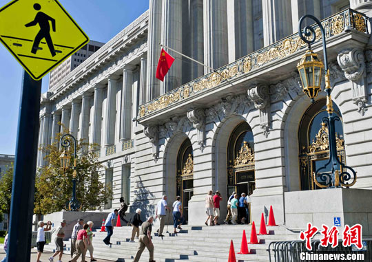 当地时间9月28日,旧金山市政府在市长办公室外的阳台上举行升旗仪式,庆祝即将到来10月1日中华人民共和国诞辰61周年和旧金山市中国传统日。中新社发 陈钢 摄
