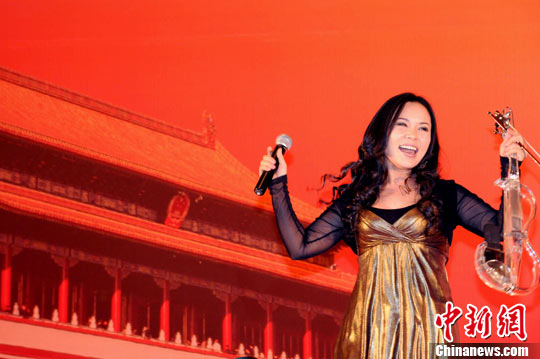 9月28日晚,国务院侨务办公室、中国海外交流协会在北京举行国庆招待晚宴,欢迎专程来北京参加新中国成立61周年庆祝活动的近600位海外侨胞和港澳台同胞。图为著名演员郭蓉演唱《红旗飘飘》。中新社发 张勤 摄