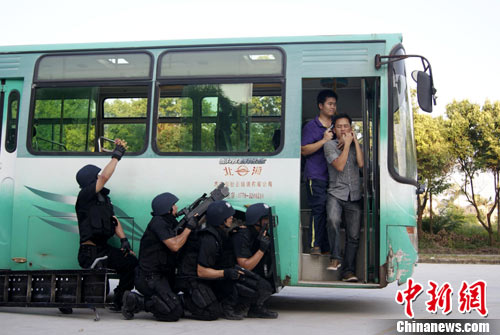 9月下旬,广西北海市特警联合、巡警、交警等多警种举行反劫持演习。此次演习模仿持枪抢劫现场,提高解救人质、谈判、排爆、团队合作等反劫持实战能力。图为特警队员往车里投爆震弹。
