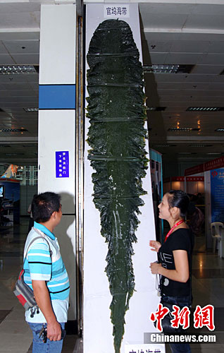 9月29日,在第五届渔博会上这条巨型海带很是吸引眼球。这条海带来自“中国海带第一村”——连江县官坞村。其海带最长可长到4.5米,一般的海带最多长到2.5米。第五届海峡(福州)渔业博览会在福州举行。张丽君 摄