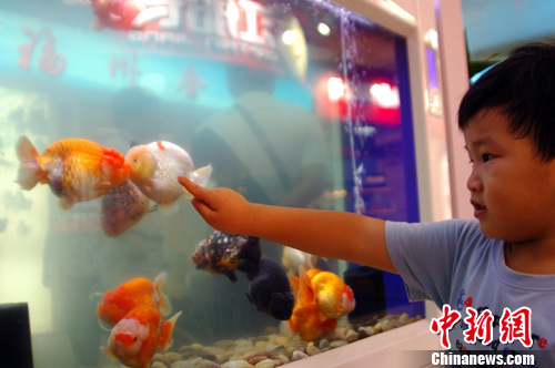 9月29日,当地小朋友正在观看身价不菲“福寿”金鱼,每只价值十几万元人民币。据本届渔博会组委会介绍,福州饲养金鱼已有300多年的历史,全世界最好的金鱼出自中国福州,在京津、苏杭、广州、福州四大金鱼产区中,福州精品金鱼列于首位,是全国金鱼三大流派之一,享誉全国。在福州举行的第五届海峡(福州)渔业博览会首度专设福州金鱼展。