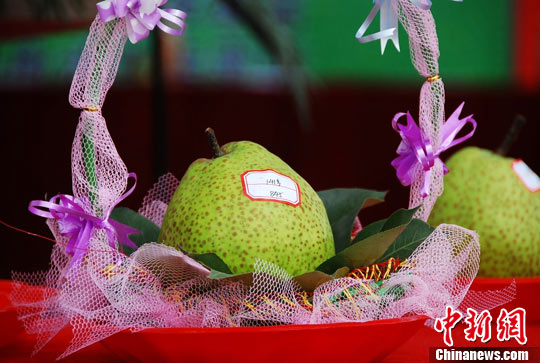 当日举行的第二届莱阳梨文化节上,莱阳市照旺庄镇西陶漳村举行了一场莱阳梨状元评选及拍卖活动,146位梨农拿着500余个大个莱阳梨来到现场参选。据悉,此次梨状元的评选标准严格,包括果重、含糖量和品相、表面光洁度等指标,综合分最高的为梨状元。